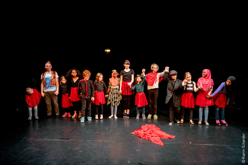 Hörgeschädigte und hörende Kinder spielen zusammen Theater.