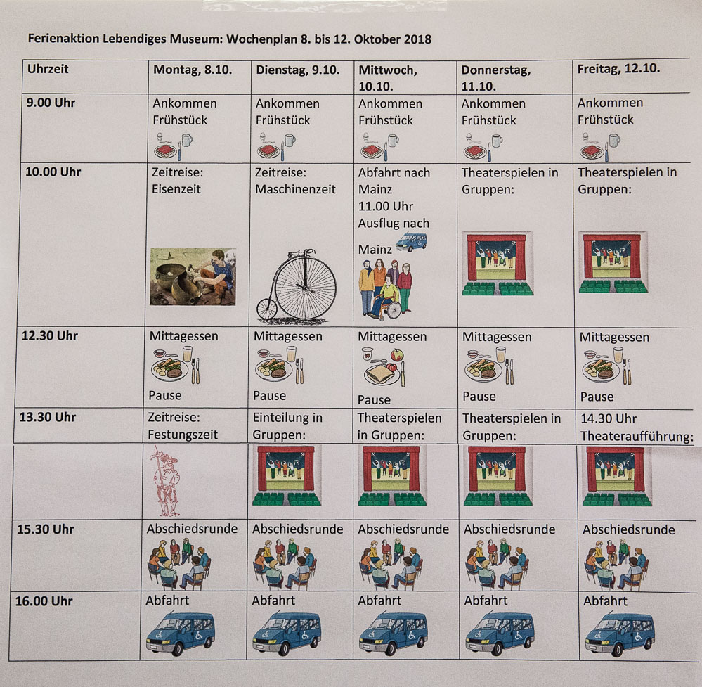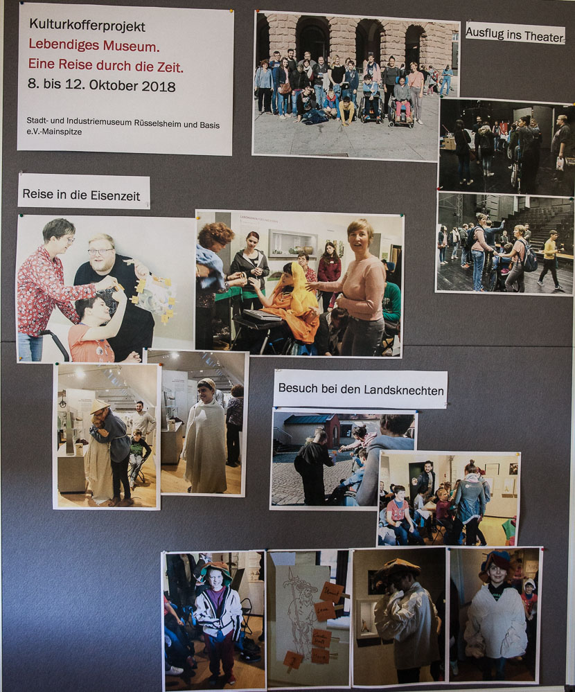 Eine Woche lang konnten Jugendliche mit Beeinträchtigungen im Stadt- und Industriemuseum Rüsselsheim in drei verschiedene Epochen eintauchen. Die Eisenzeit, das Mittelalter der Landsknechte und das ausgehende 19. Jahrhundert wurden dabei lebendig. Wesentliche Punkte bei der Vermittlung spielten gerade die sinnlichen Eindrücke: Rauch, Stroh und Tabak wurde gerochen, Fell gefühlt, Maggi und der Ersatzkaffee „Muckefuck“ probiert. Die Teilnehmer*innen sollten die Gelegenheit bekommen, die jeweilige Epoche mit allen Sinnen zu erfahren und die Eindrücke dadurch in ihr Körpergedächtnis zu holen, um sich so mit der Vergangenheit zu verbinden. Dabei schlüpften die Teilnehmer*innen natürlich auch in die Kleidung der jeweiligen Zeit. Als besonderes Highlight ging es ins Staatstheater Mainz, um dort hinter die Kulissen zu schauen und sich auf die eigene Präsentation vorzubereiten.