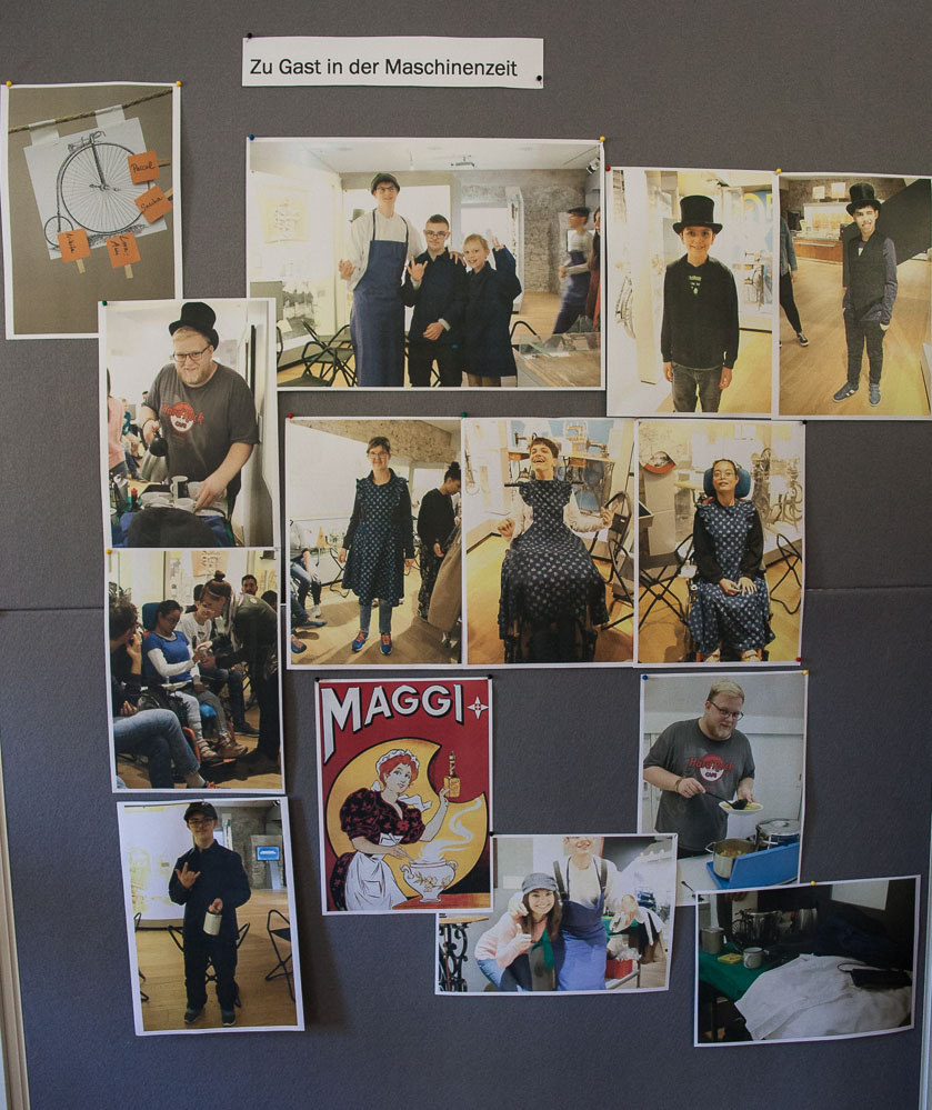 Am Freitagnachmittag, dem letzten Tag der Woche war es dann endlich soweit Gäste einzuladen, um die gemachten Erfahrungen in einem Theaterstück zu teilen. Dem Publikum reichte man die verschiedenen Gerüche der unterschiedlichen Zeiten zum Einatmen und erzählte bildhaft von den wichtigsten Hintergrundinformationen der Epochen. Per geräuschvoller Zeitmaschine und mit dem richtigen Zeitschlüssel bestückt ging es dann zu den Landsknechten mit einer kleinen Szene, die den Lebensalltag darstellte – die Landsknechte liebten das Spiel mit den Würfeln. Anschließend wanderte das bunte Ensemble mit seinem Publikum durch das Museum zu den Dampfmaschinen. Fabriklärm war zu hören, es wurde geschraubt und gehämmert und schließlich noch die Hand des Herrn Opel gedrückt. Unter großem Applaus bekamen alle Beteiligten zum Abschied eine Rose mit auf den Weg.