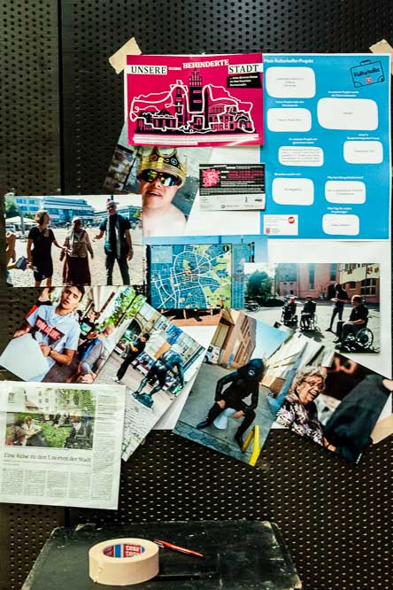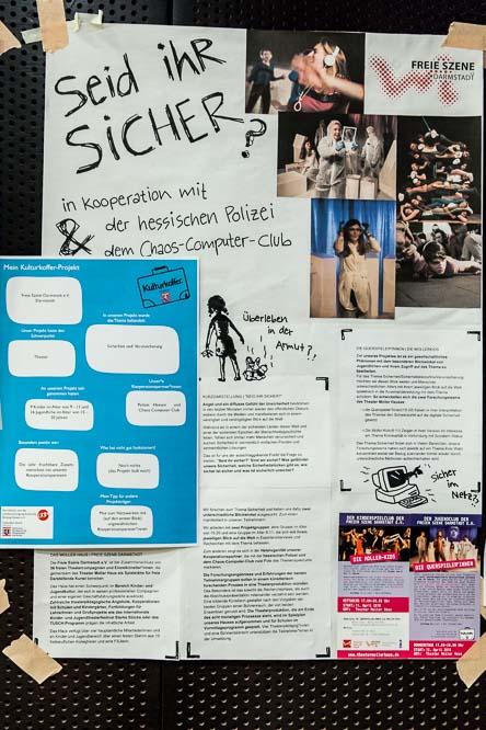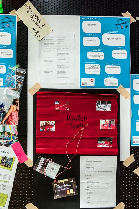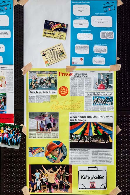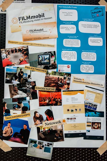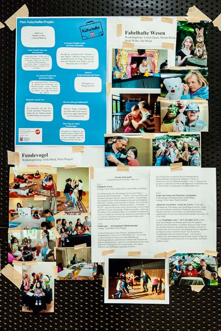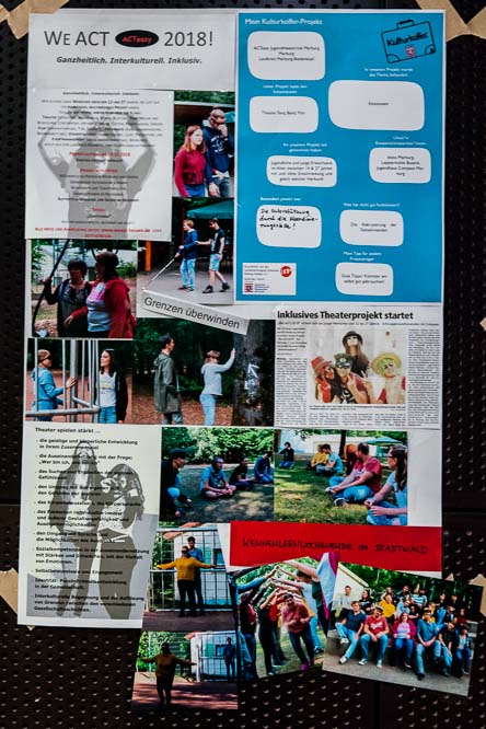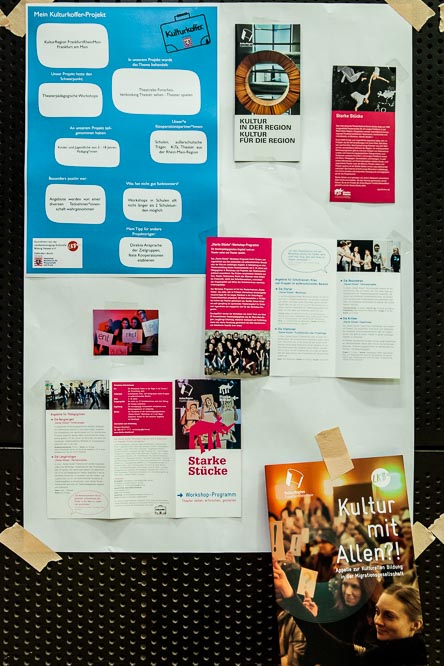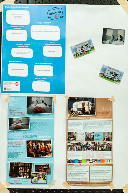 Gleich beim Ankommen konnten die Teilnehmer*innen ihre offenen Fragen für alle Thementische am Empfang abgeben, so hatten alle die Möglichkeit, sich überall inhaltlich einzubringen. Außerdem konnte sich jedes Projekt kreativ am „Markt der Möglichkeiten“ ausleben und dort die eigene Arbeit den anderen vorstellen. Der Hausherr des KFZ, Gero Braach, und Susanne Hilf, Geschäftsleitung der LKB, begrüßten die Runde und die Projektleitung des Kulturkoffers, Antje Erdmann, führte durch den ersten gemeinsamen Teil der Veranstaltung. Drei Programmpunkte sollten in die vielfältige Welt des Kulturkoffers einführen: Das Kulturkoffervideo wurde präsentiert. Anschließend zeigten Silvia Pahl und Klaus Wilmanns vom Theater 3hasen oben live auf der Bühne, wie die interaktive Arbeit mit ihrem Kultur-Anstifter-Mobil vonstatten geht. Die Teilnehmer*innen waren zudem aufgefordert, sich eine Frage aus dem Zylinderhut der Kunstlose zu ziehen, um sie später einem beliebigen Gegenüber spontan zu stellen. Die perfekte Überleitung zu den Arbeitsgruppen bot das Interview von Ida Farkas aus der Koordinierungsstelle Kulturkoffer mit Tobias Kurth, Projektleiter des Limburger Projekts Salad Bowl Culture, der über seine Art der Zielgruppenakquise bei Jugendlichen aus dem Nähkästchen plauderte.